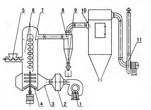 氣固混合階段:經過粉碎后,物料在閃蒸干燥主塔內與加熱介質充分的接觸。其中,氣固混合的好壞決定整個干燥速率的大小。為了提高氣流速度,在閃蒸干燥機的底部設置倒錐結構裝置。